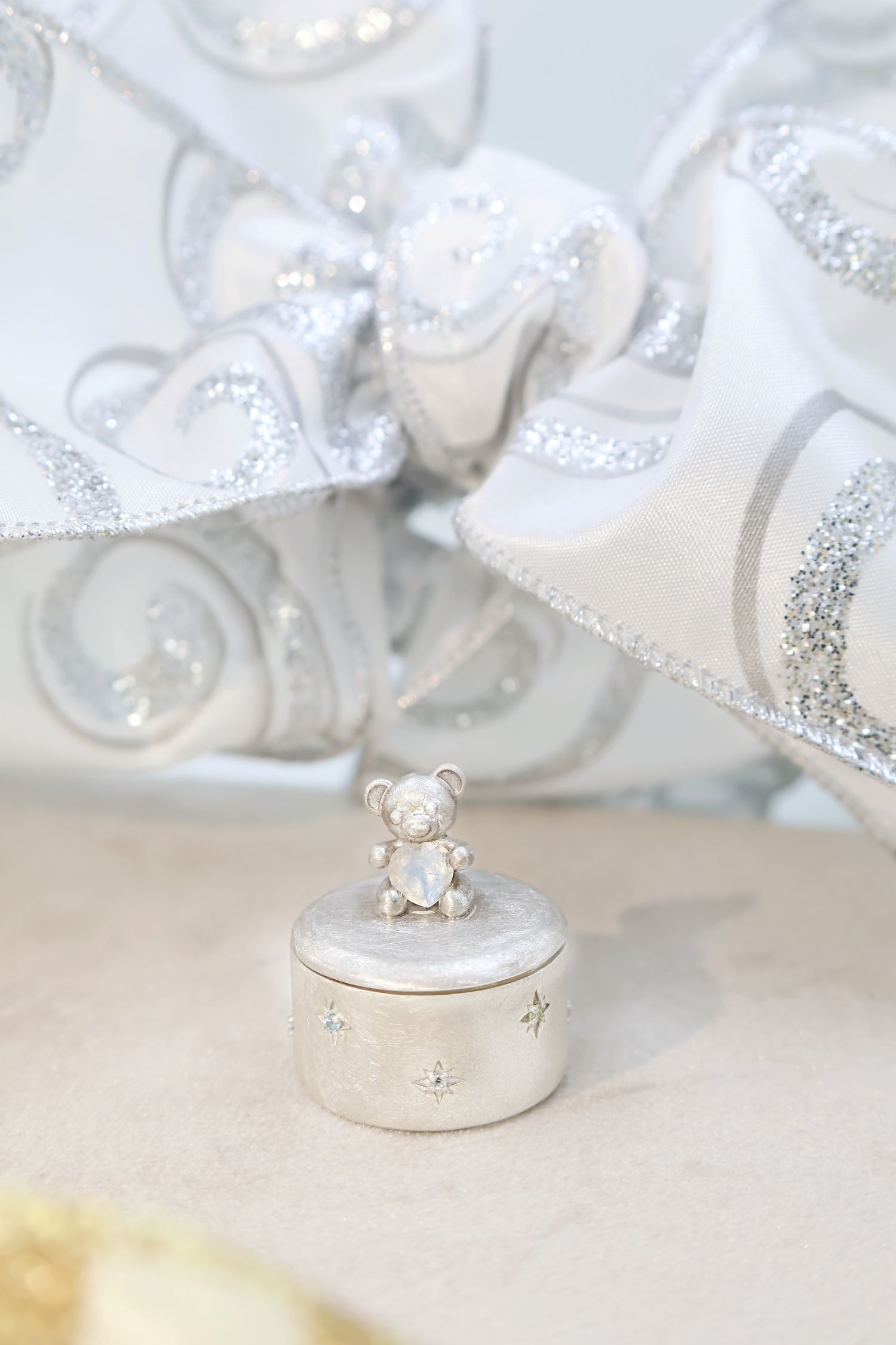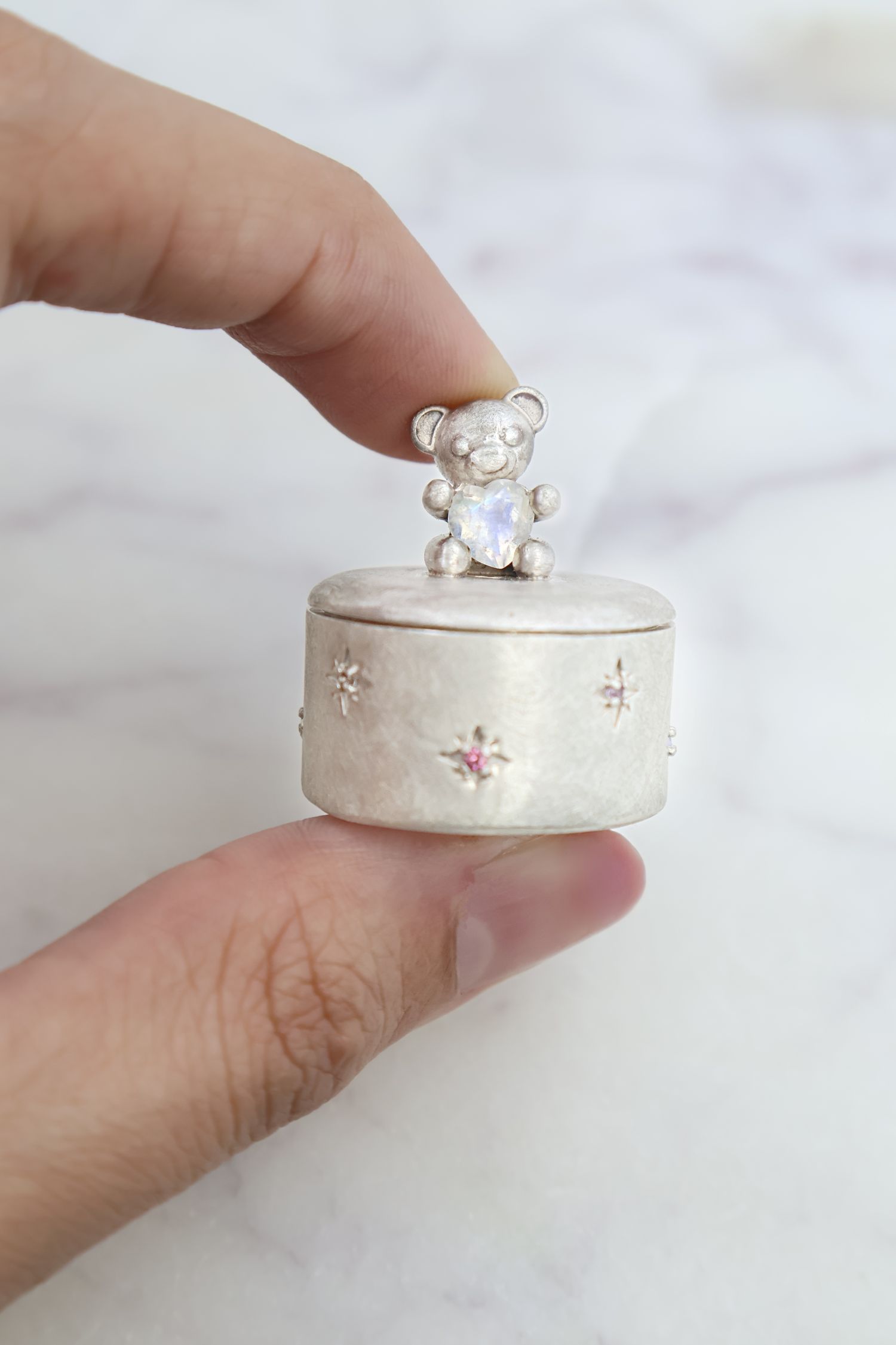 Con Petro sentado y abrazando una gema Moonstone corte corazón, sobre su cajita con estrellas y acomodo Arcoíris Pastel 🌈 Cuenta con acabado texturizado dando un look súper lindo y único.