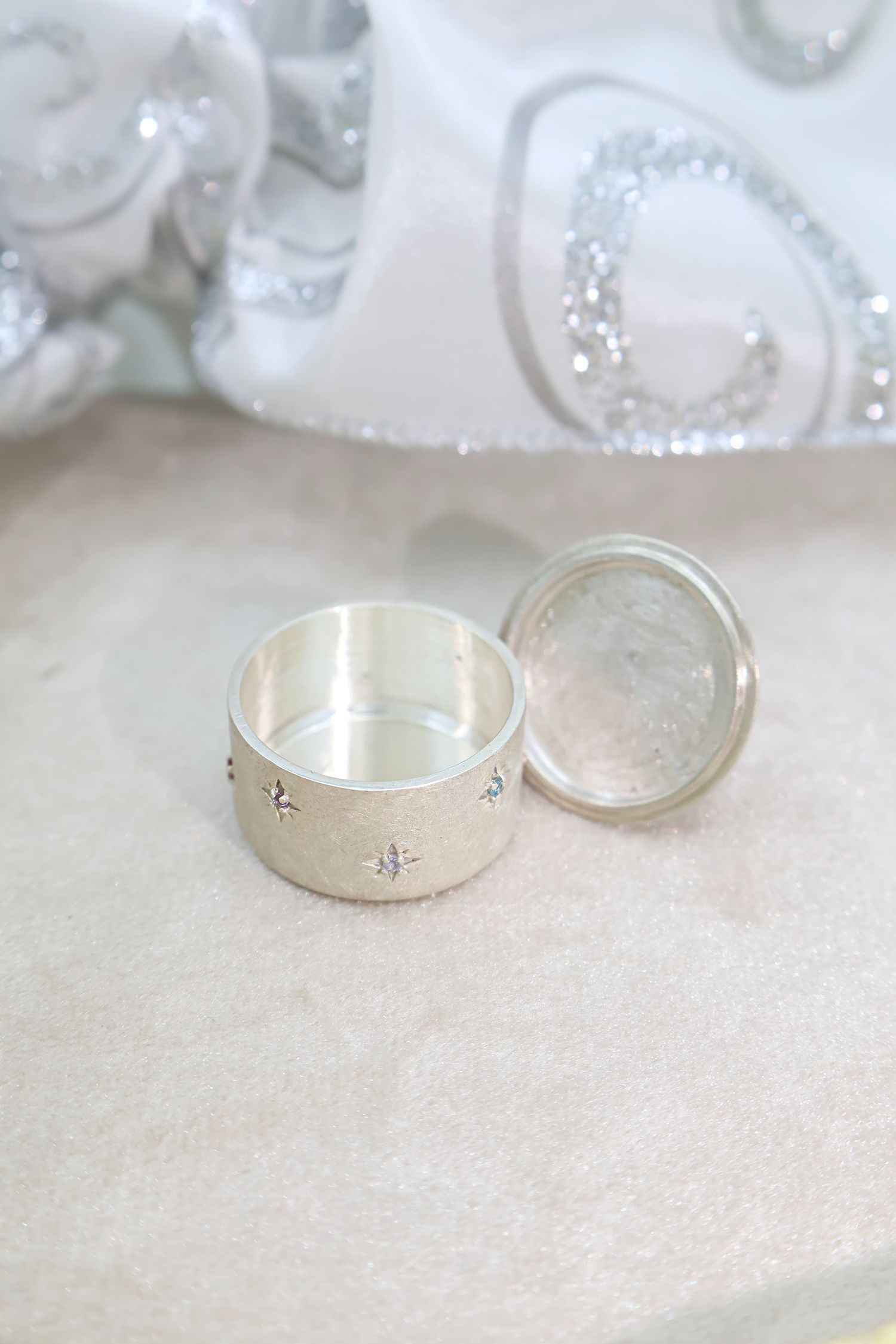 Cajita de plata .925 con piedra moonstone y acomodo arcoíris en su exterior (cuenta con amatista, tanzanita, topacio swiss blue, peridoto, citrino, turmalina rosa, zafiro naranja)