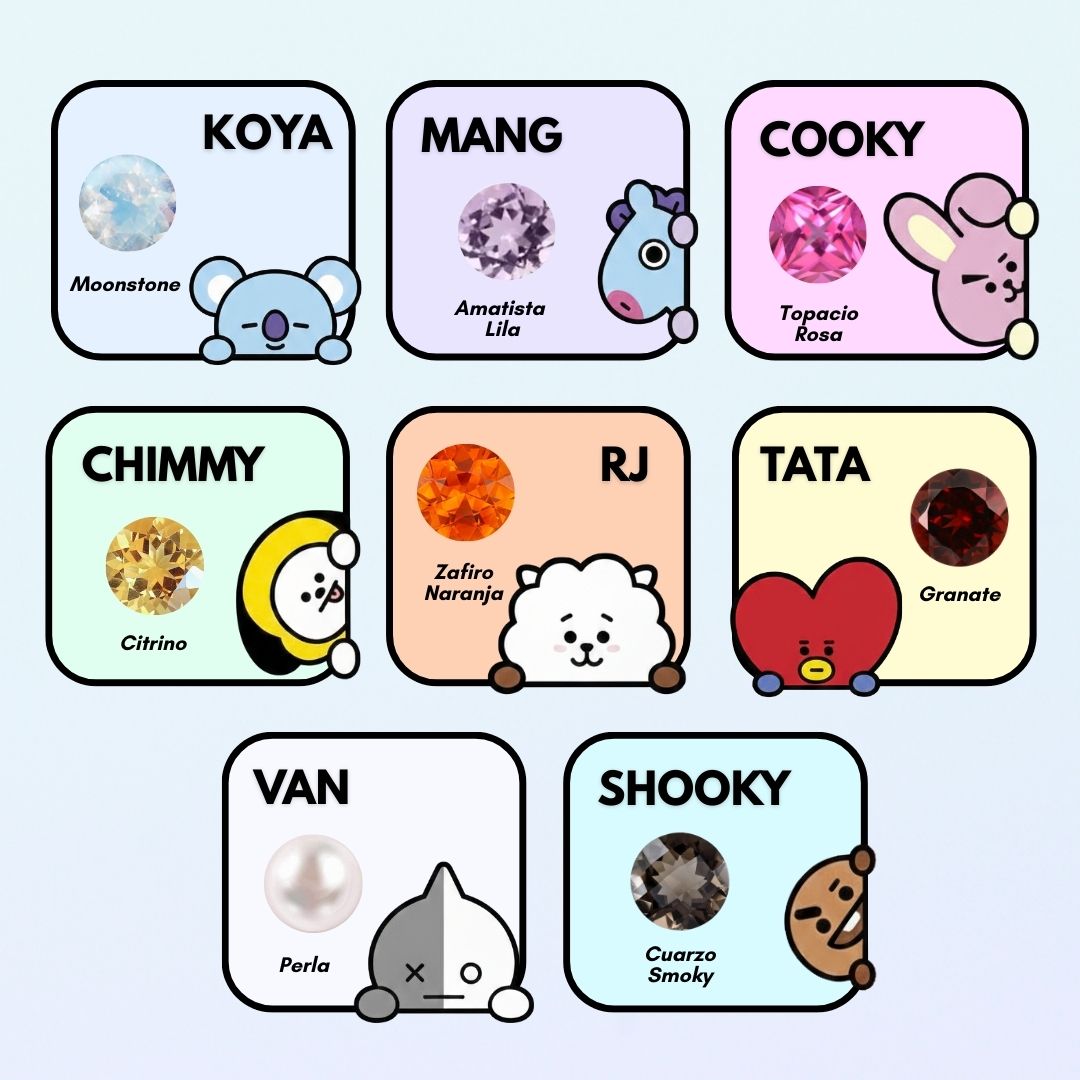 | Piedra BT21 | RJ – Zafiro naranja, COOKY – Topacio rosa, CHIMMY – Citrino, TATA – Granate, KOYA – Moonstone, SHOOKY – Cuarzo Smoky, MANG – Amatista lila, VAN – Perla |