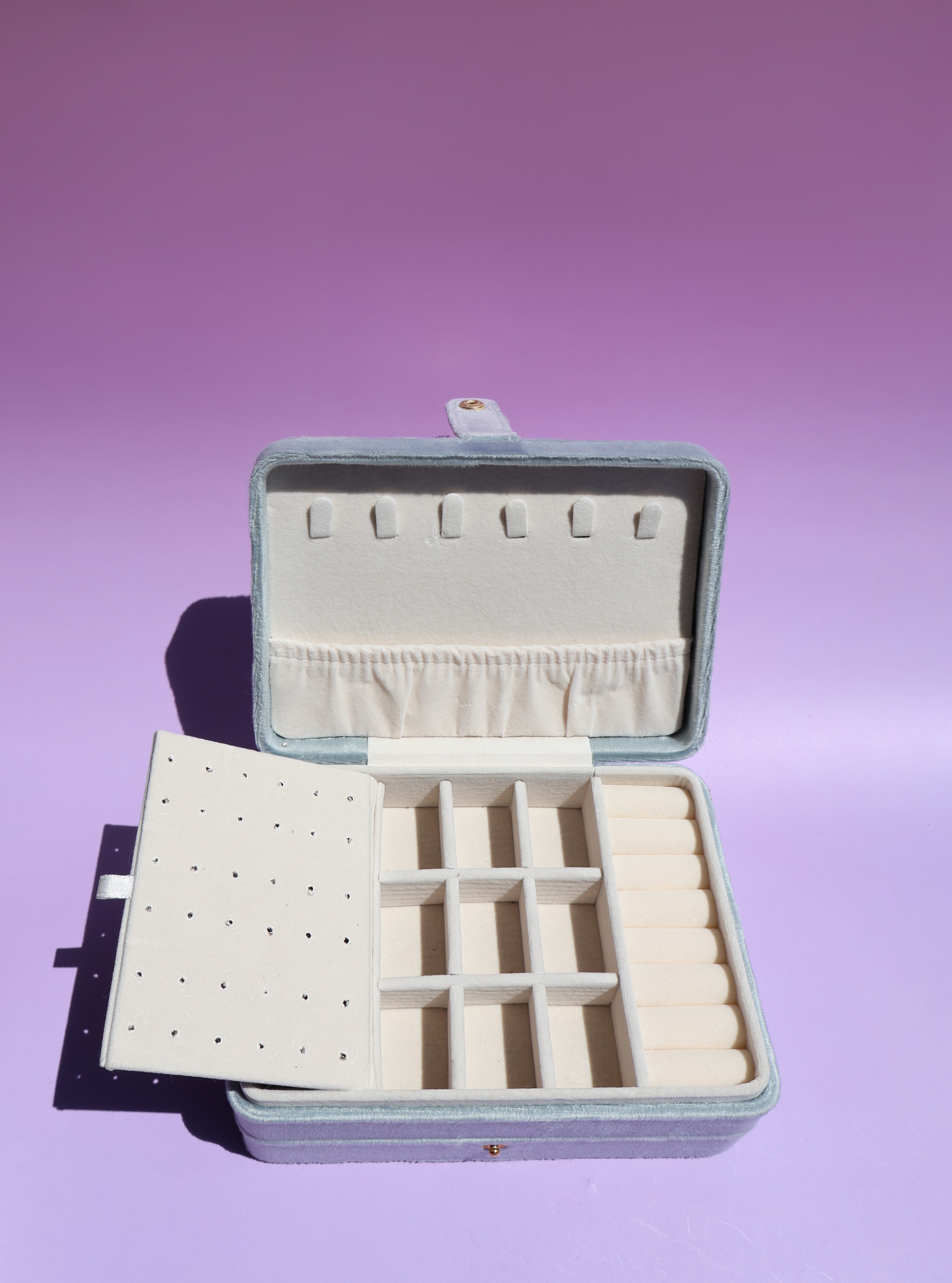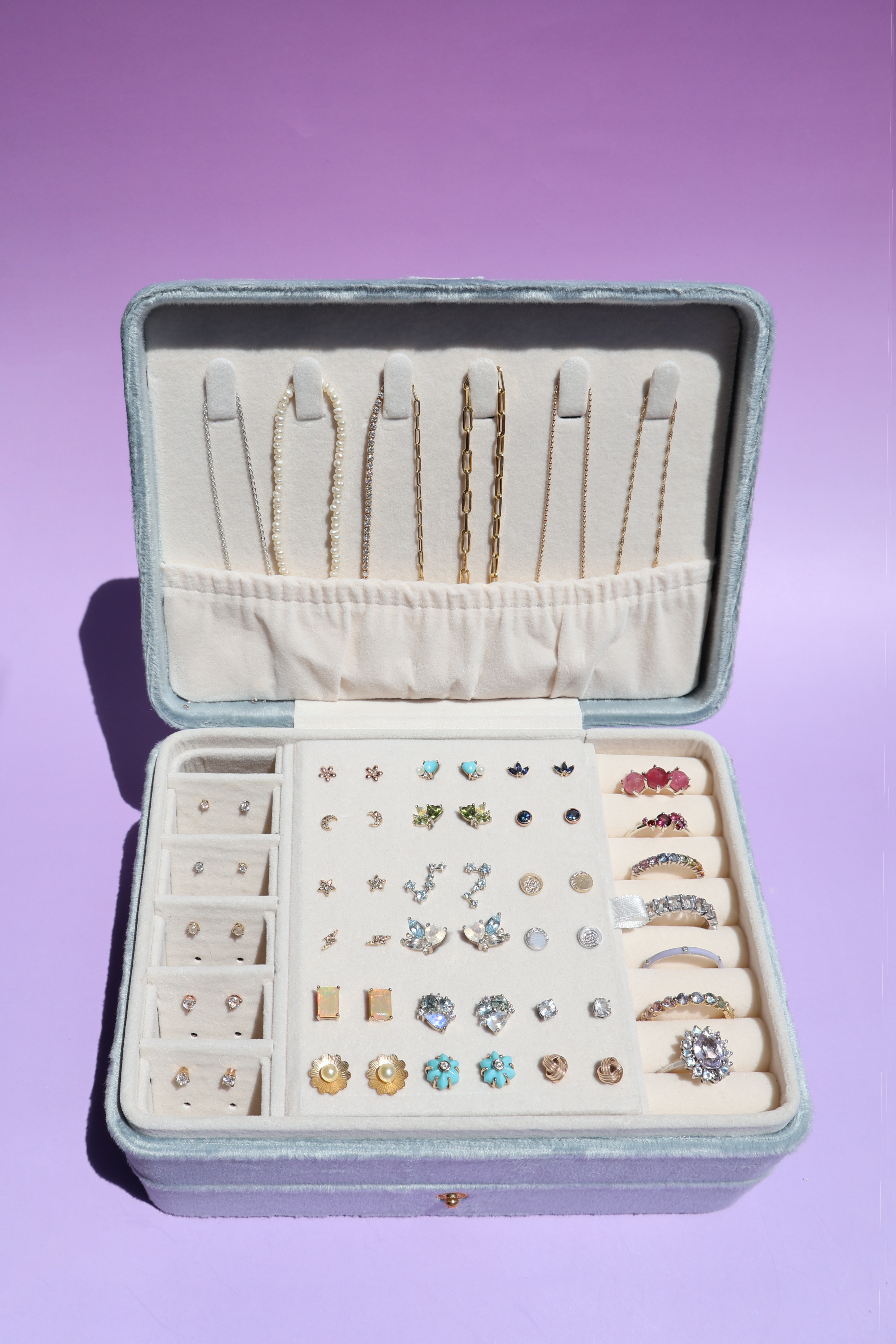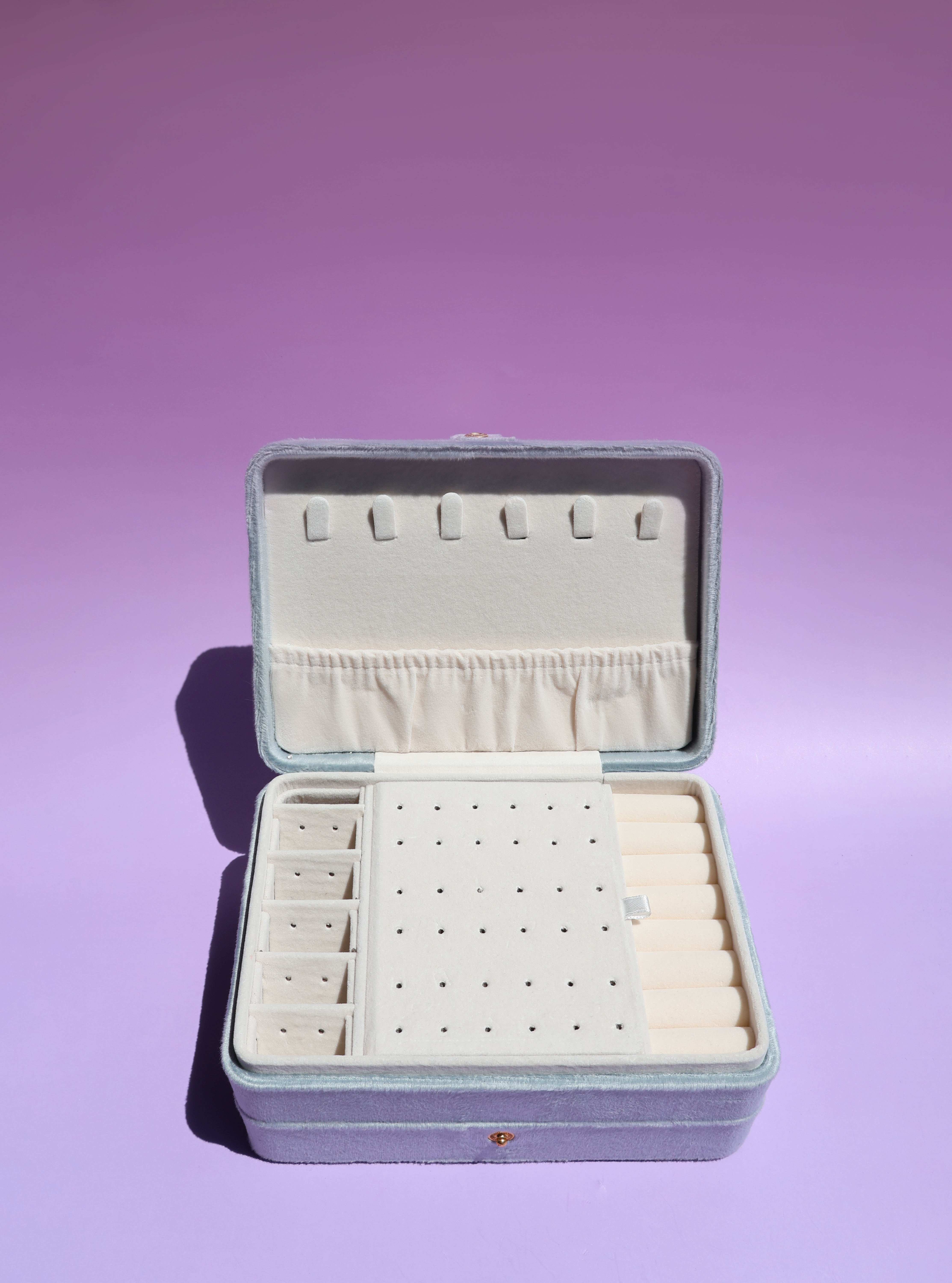Ideal para organizar toda tu joyería fina, tiene dos niveles para tus anillos, collares, pulseras, aretes y dijes. Con la tela más elegante, suave y broche dorado, para fácil acceso.
