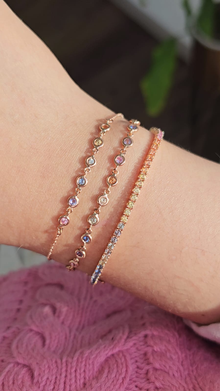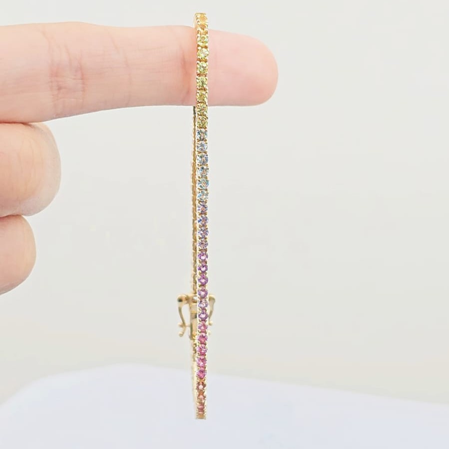 Nuestra pulsera tennis Panfo arcoíris pastel hecha con peridoto, citrino, zafiro naranja, zafiro rosa, amatista lila, tanzanita y topacio swiss blue. Es perfecta.